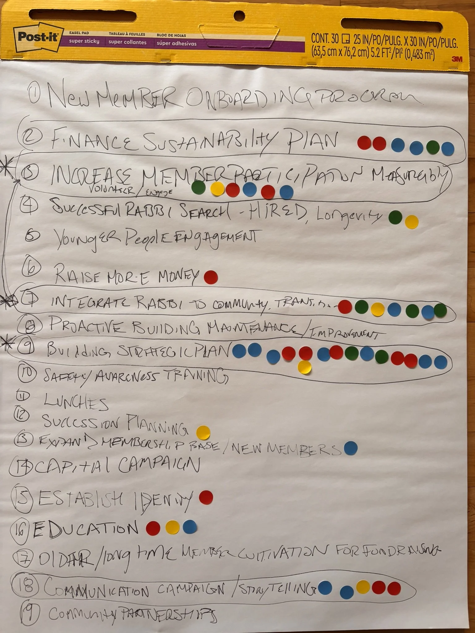 It was difficult, but we winnowed our top priority list down to the three biggest rocks: 1) Devising a strategic plan about what to do with our building; 2) Welcoming a new rabbi and developing a smooth transition plan to integrate the rabbi and; 3) Measurably increasing membership participation. Every one of these priorities is related to another and affect each other. They are neither singular nor exist in a vacuum but are interdependent.